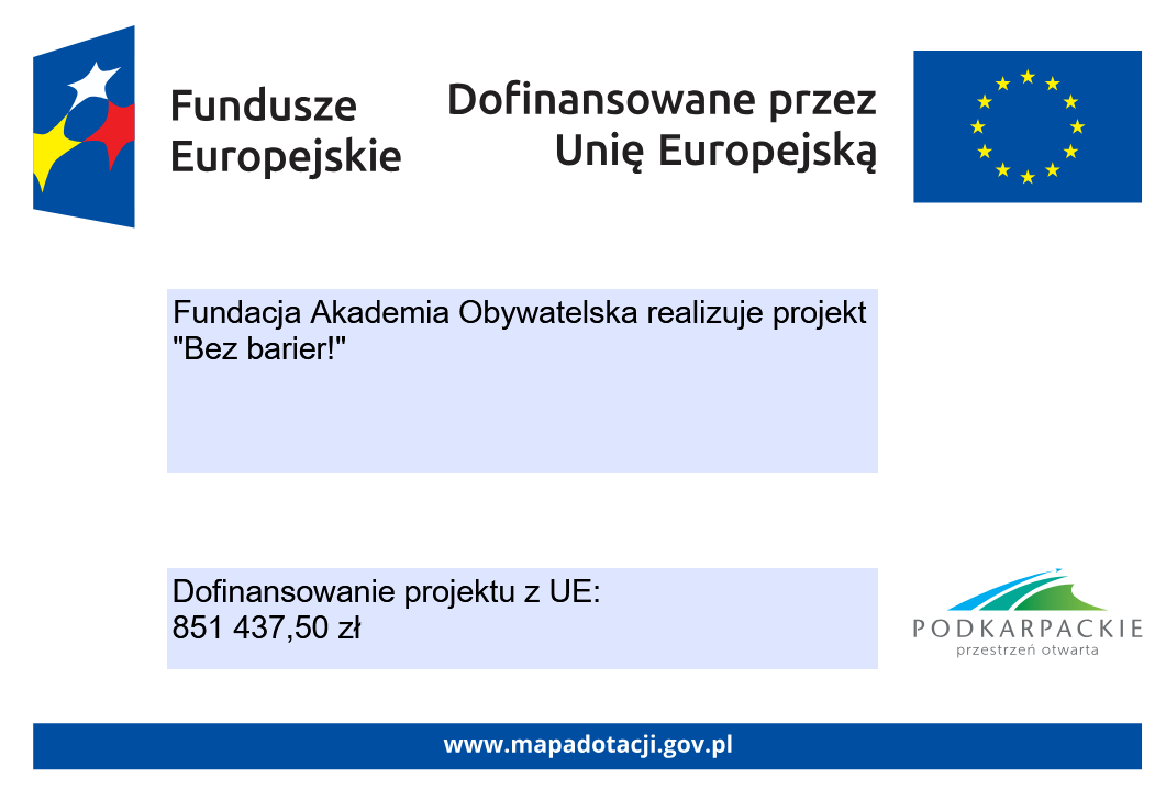 Informujemy, iż zamykamy pierwszy nabór Uczestników do projektu „Bez Barier” (nr FEPK.07.08-IP.01-0031/23), realizowanym przez Fundację Akademia Obywatelska.